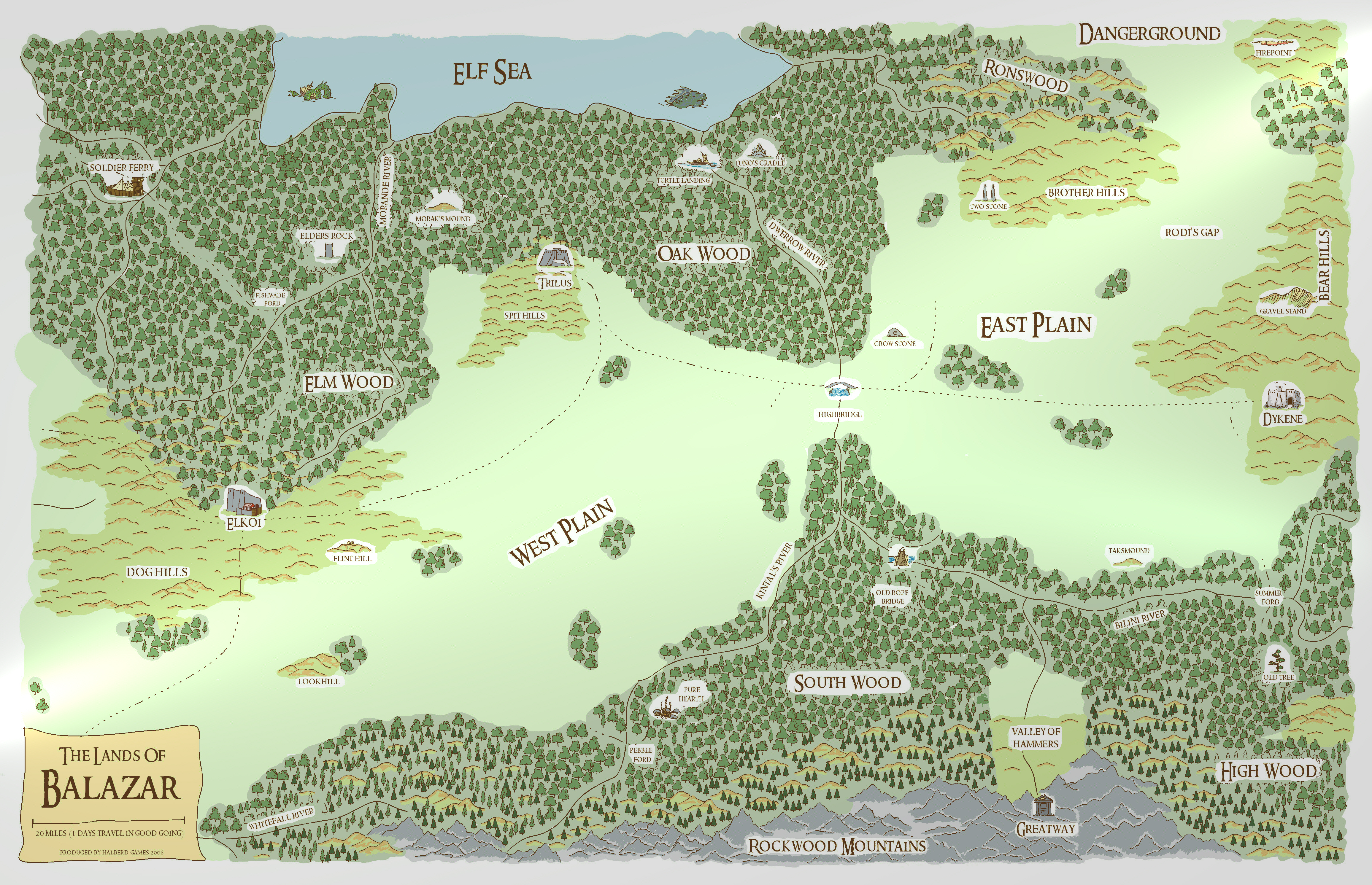 The following map of Balazar was produced by Carl Sifford. This second edition incorporates a number of improvements and changes. It is based on the book Griffin Mountain by Paul Jaquays, Rudy Kraft, and Greg Stafford (ISS 1606).